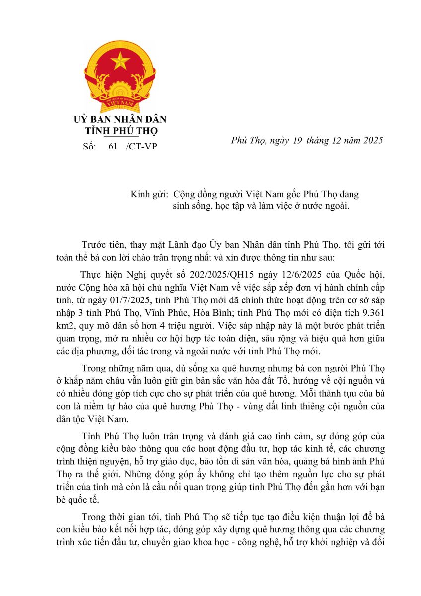 Ngày 19/12, đồng chí Trần Duy Đông, Phó Bí thư Tỉnh ủy, Chủ tịch UBND tỉnh gửi thư thăm hỏi và chúc Tết cộng đồng người Việt Nam gốc Phú Thọ đang sinh sống, học tập và làm việc ở nước ngoài. Trang thông tin điện tử Sở Ngoại vụ tỉnh Phú Thọ trân trọng giới thiệu toàn văn bức thư.