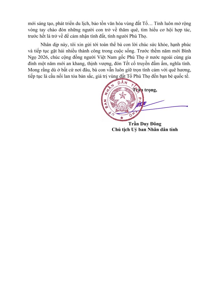 Nhân dịp này, tôi xin gửi tới toàn thể bà con lời chúc sức khỏe, hạnh phúc và tiếp tục gặt hái nhiều thành công trong cuộc sống. Trước thềm năm mới Bính Ngọ 2026, chúc cộng đồng người Việt Nam gốc Phú Thọ ở nước ngoài cùng gia đình một năm mới an khang, thịnh vượng, đón Tết cổ truyền đầm ấm, nghĩa tình. Mong rằng dù ở bất cứ nơi đâu, bà con vẫn luôn giữ trọn tình cảm với quê hương, tiếp tục là cầu nối lan tỏa bản sắc, giá trị vùng đất Tổ Phú Thọ đến bạn bè quốc tế.