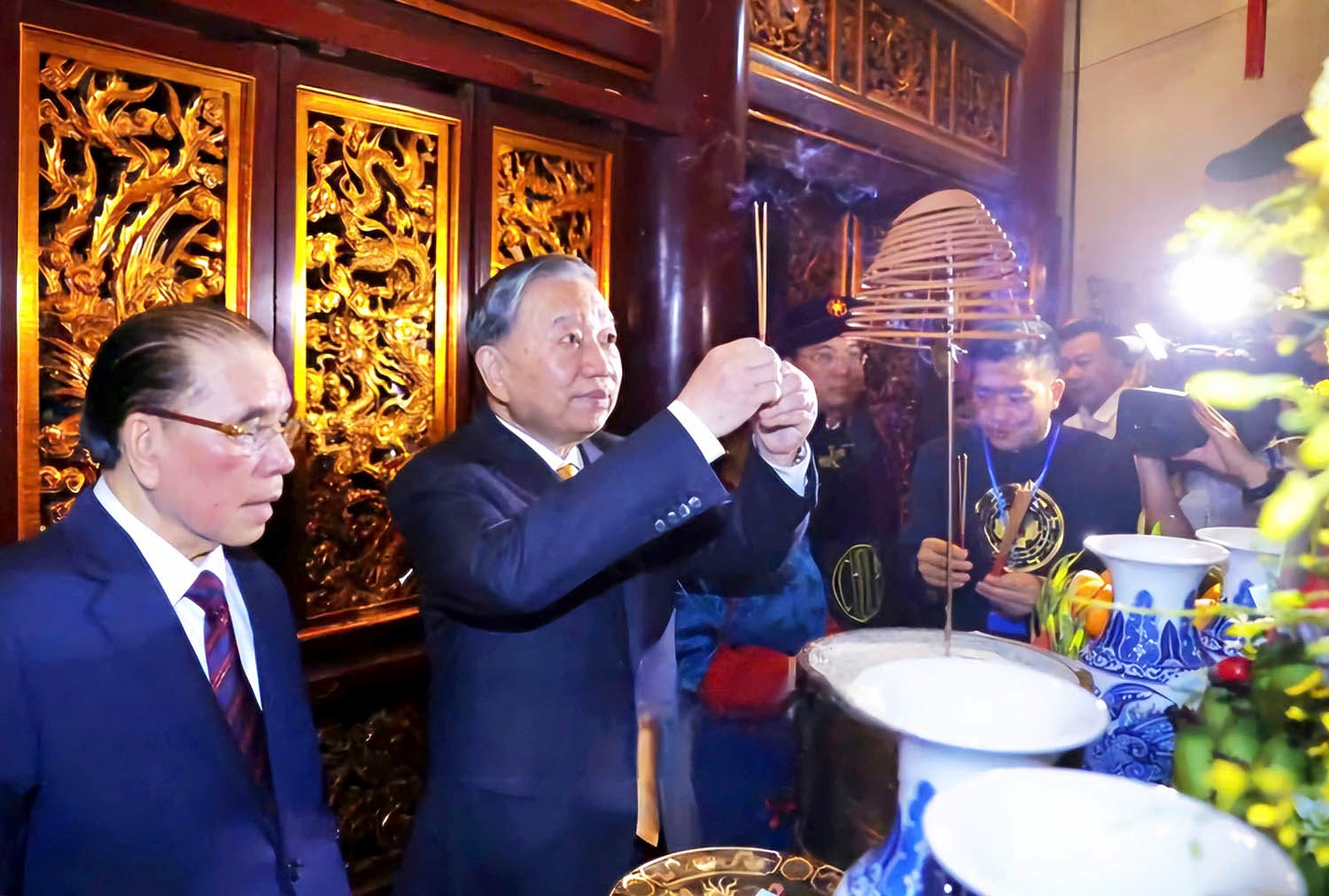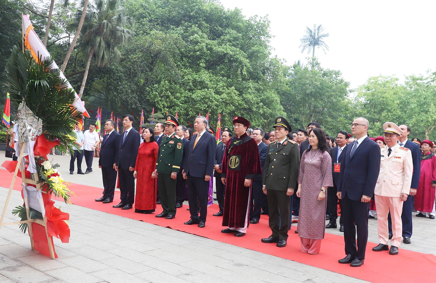 Tham dự Lễ dâng hương có các đồng chí: Tô Lâm - Tổng Bí thư, Chủ tịch nước; Nông Đức Mạnh - nguyên Tổng Bí thư; Nguyễn Thị Kim Ngân - nguyên Ủy viên Bộ Chính trị, nguyên Chủ tịch Quốc hội; Bùi Thị Minh Hoài - Ủy viên Bộ Chính, Bí thư Trung ương Đảng, Chủ tịch Ủy ban Trung ương MTTQ Việt Nam; Nguyễn Duy Ngọc - Ủy viên Bộ Chính trị, Bí thư Trung ương Đảng, Trưởng Ban Tổ chức Trung ương; Trần Sỹ Thanh - Ủy viên Bộ Chính trị, Bí thư Trung ương Đảng, Chủ nhiệm Ủy ban Kiểm tra Trung ương; Trịnh Văn Quyết - Ủy viên Bộ Chính trị, Bí thư Trung ương Đảng, Trưởng Ban Tuyên giáo và Dân vận Trung ương; Nguyễn Thanh Nghị - Ủy viên Bộ Chính trị, Bí thư Trung ương Đảng, Trưởng Ban Chính sách, chiến lược Trung ương; Đại tướng Phan Văn Giang - Ủy viên Bộ Chính trị, Phó Thủ tướng Chính phủ, Bộ trưởng Bộ Quốc phòng; đồng chí Lương Tam Quang - Ủy viên Bộ Chính trị, Bộ trưởng Bộ Công an; Lê Hoài Trung, Ủy viên Bộ Chính trị, Bộ trưởng Bộ Ngoại giao; Phạm Thị Thanh Trà - Bí thư Trung ương Đảng, Phó Thủ tướng Chính phủ; Nguyễn Văn Quảng - Bí thư Trung ương Đảng, Bí thư Đảng ủy, Chánh án Toà án Nhân dân tối cao; Nguyễn Khắc Định - Ủy viên BCH Trung ương Đảng, Phó Chủ tịch Quốc hội; Nguyễn Hồng Diên - Ủy viên BCH Trung ương Đảng, Phó Chủ tịch Quốc hội.