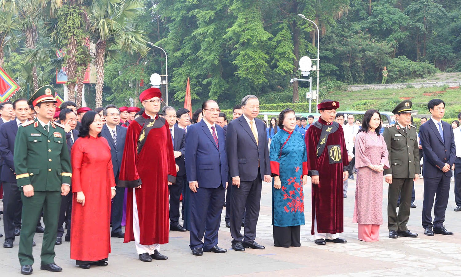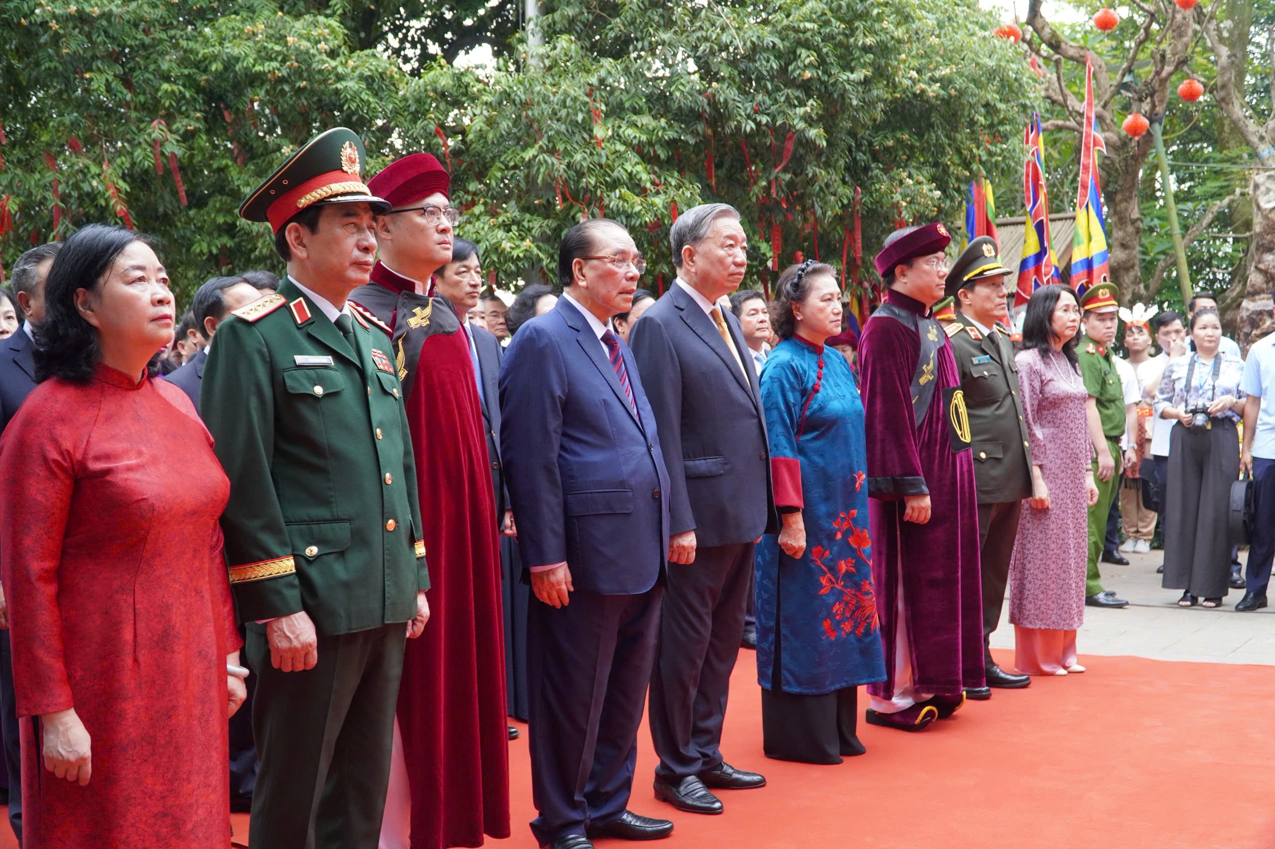 Tổng Bí thư, Chủ tịch nước Tô Lâm; nguyên Tổng Bí thư Nông Đức Mạnh; nguyên Ủy viên Bộ Chính trị, nguyên Chủ tịch Quốc hội Nguyễn Thị Kim Ngân cùng các đại biểu dự Lễ dâng hương tưởng niệm các Vua Hùng