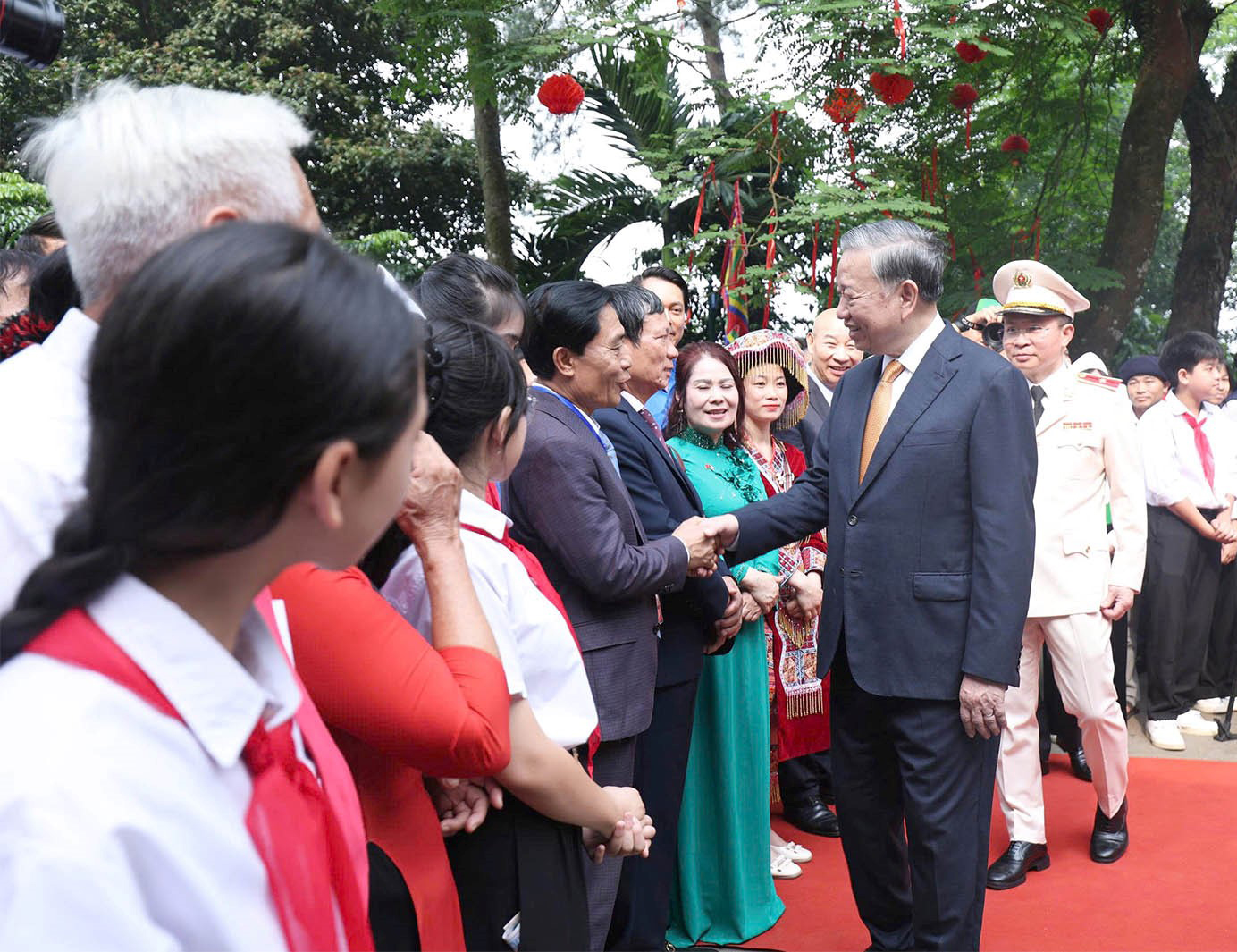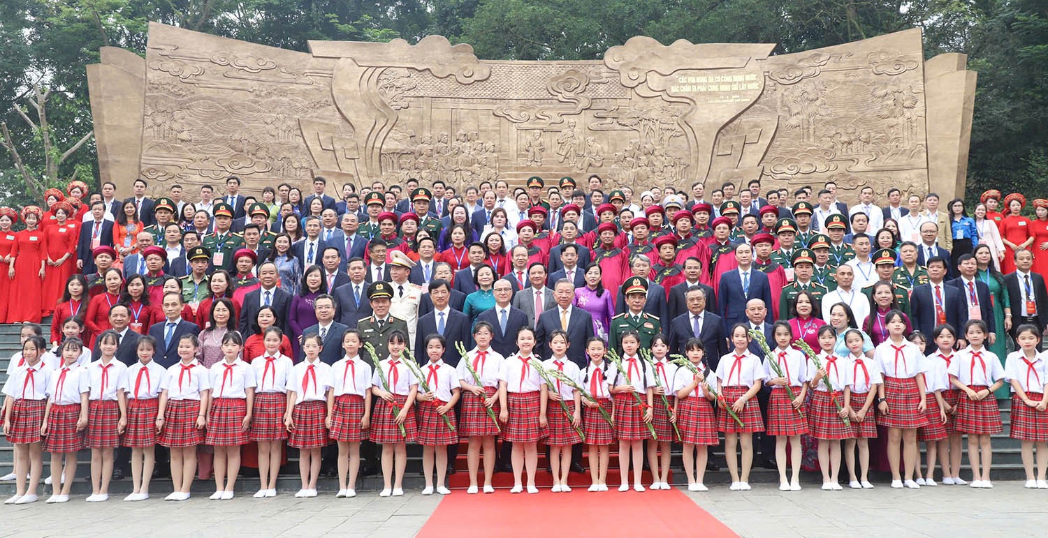 Tổng Bí thư, Chủ tịch nước Tô Lâm; nguyên Tổng Bí thư Nông Đức Mạnh; nguyên Ủy viên Bộ Chính trị, nguyên Chủ tịch Quốc hội Nguyễn Thị Kim Ngân và các đại biểu chụp ảnh lưu niệm cùng các em thiếu nhi tại Bức phù điêu Bác Hồ nói chuyện với cán bộ, chiến sĩ Đại đoàn quân Tiên phong