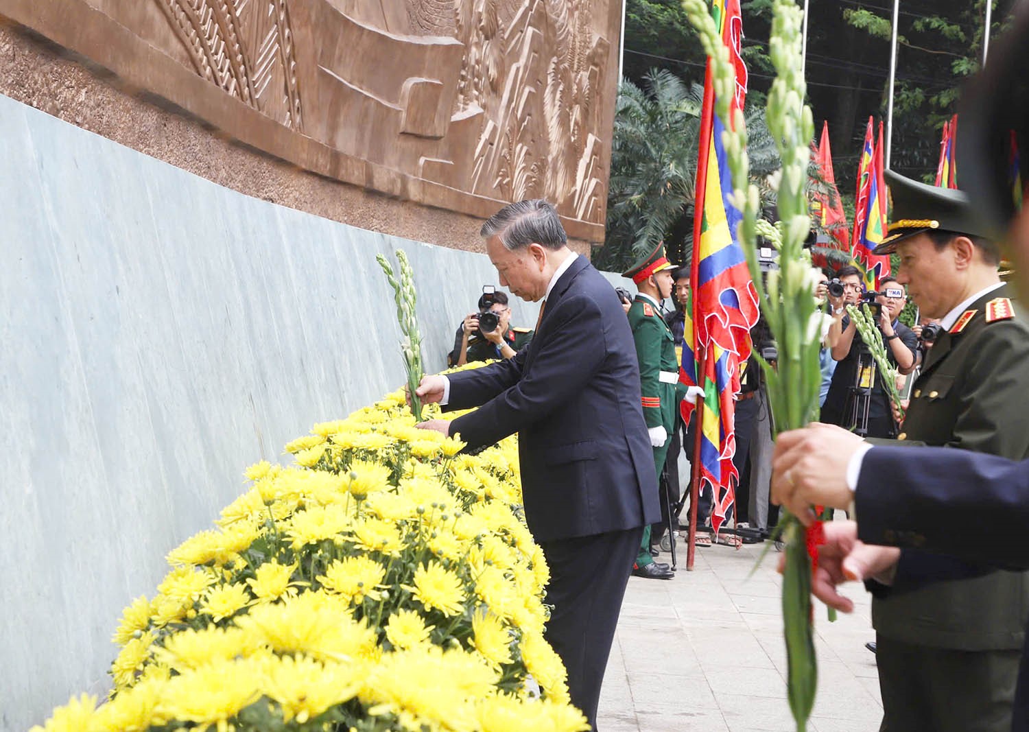 Tổng Bí thư, Chủ tịch nước Tô Lâm; nguyên Tổng Bí thư Nông Đức Mạnh; nguyên Ủy viên Bộ Chính trị, nguyên Chủ tịch Quốc hội Nguyễn Thị Kim Ngân và các đại biểu dâng hoa tại Bức phù điêu Bác Hồ nói chuyện với cán bộ, chiến sĩ Đại đoàn quân Tiên phong